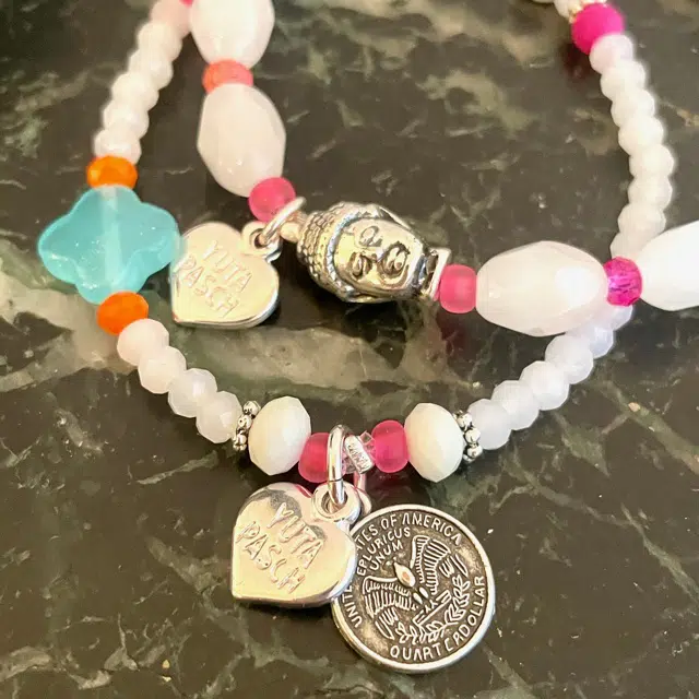 Bestehend aus Buchstabenperlen aus Glas, Glasschliffperlen, einem Halbedelstein und versilberte Elemente und Anhänger.