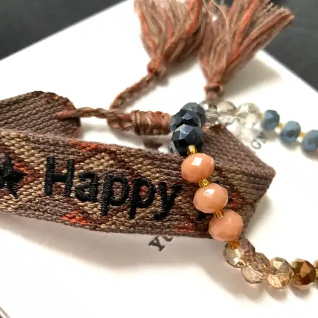 Materialien: Baumwollband HAPPY, Armband mit Glasschliffsteinen, Rocaillesperlen und Metall