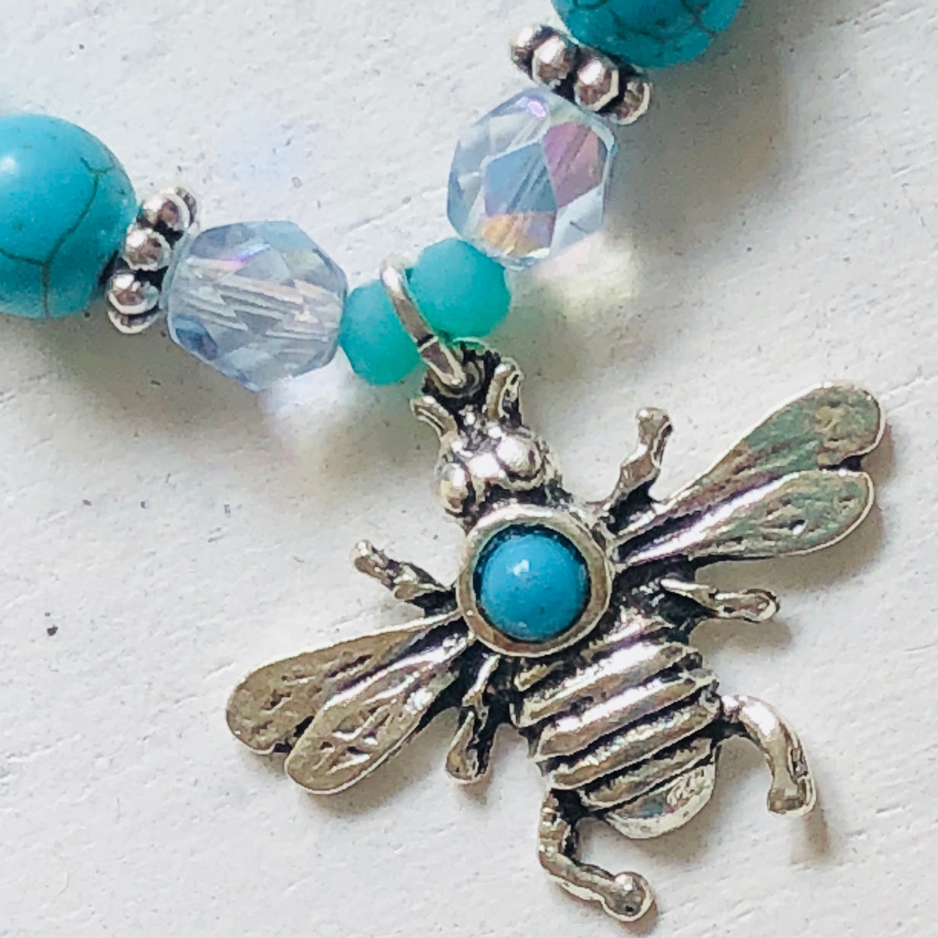 Statement Armband mit kleinen Bienchen, die uns an mehr Umweltbewußtsein erinnern sollen!! Halbedelsteine = Howlith, geschliffenes Glas in wunderschönen Blautönen, versilberte Elemente nickelfrei, one size