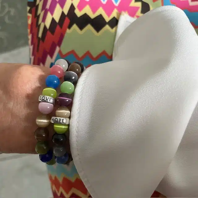 LOVE ist die Botschaft in Sterling Silber eingerahmt von Edelstein Perlen. Dieser Edelstein soll Sicherheit geben und das Selbstbewusstsein stärken.