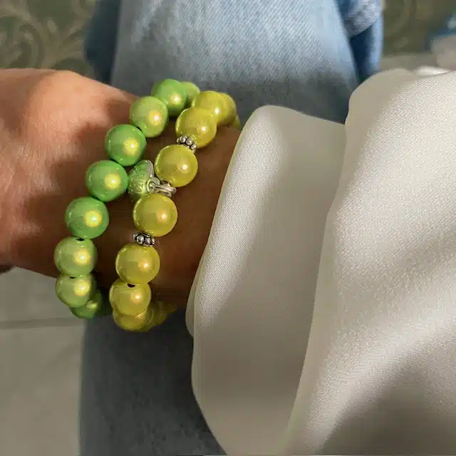 Zwei schlichte Statement Armbänder beinhaltet dieses Set, welches durch die Farben und den Glanz der Perlen besticht. Die Perlen sind 8 mm dick.