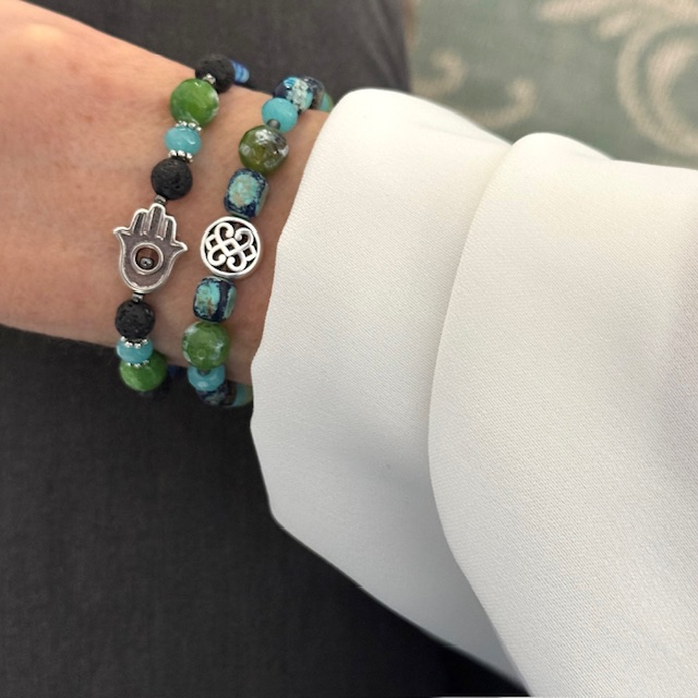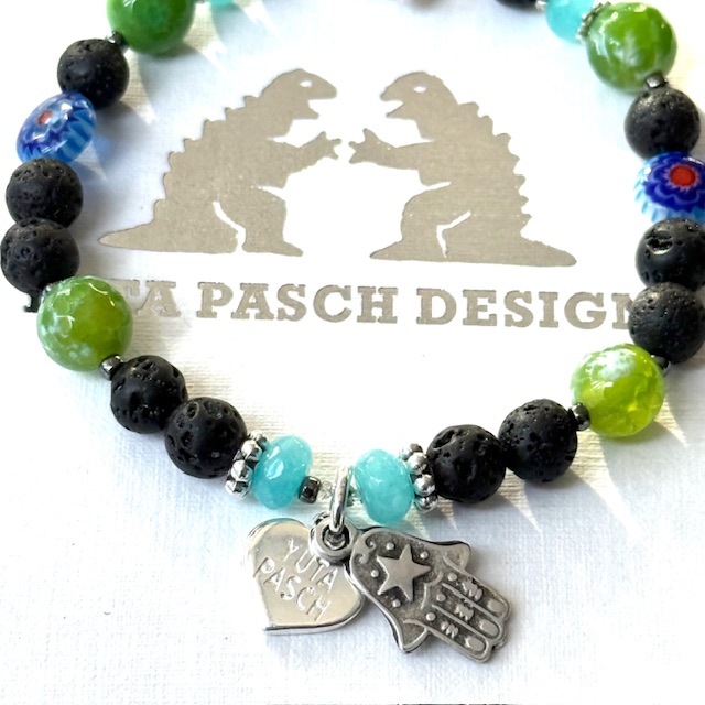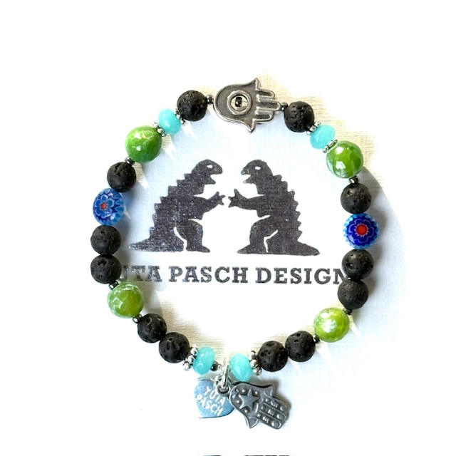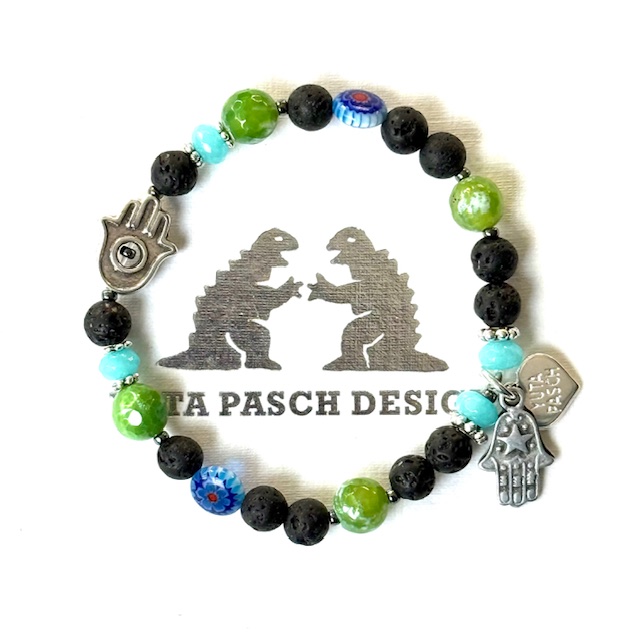 Eine schützende Hand ist immer ein schöner Begleiter. Hier ist sie verarbeitet mit Lavakugeln, Muranogläsern und Edelsteinen wie Jade und Achate.