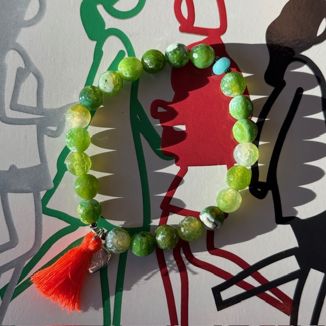 Edelstein Armband mit wunderschönen, apfelgrünen Edelsteinen, Achate und einer Quaste. Schön zu kombinieren mit A 496.