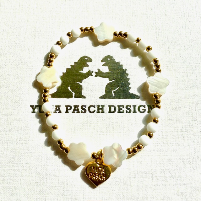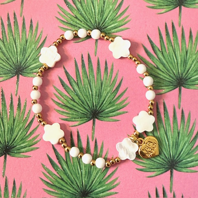 Schlichtes, elegantes Armband mit wunderbaren Materiellen: 18 K vergoldete Kügelchen, weißer Achat und Perlmutt. Unser Logoherz ist 24 K vergoldet.