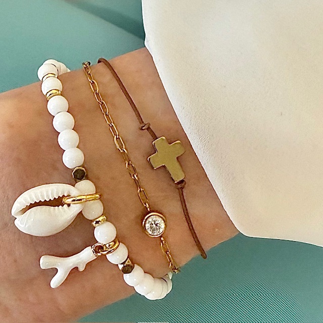 Feines Sommerarmband mit echter Muschel, einem emailliertem Anhänger in Korallenform, weißen Porzellanperlen, Edelsteinen Hematite, 18 K vergoldete Zwischenteile und unserem 24 K vergoldeten Logoherz.