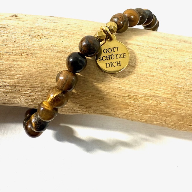Edelstein Armband, Tigerauge mit einem 18 K vergoldeten Anhänger GOTT SCHÜTZE DICH und Halbedelsteinen Hämatit.