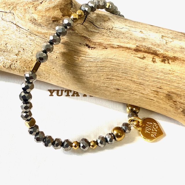 Elegantes Armband im Gold- Silber- Mix mit schönen Materialien: Versilberte Glasperlen 4 mm, goldene Halbedelsteine, Hämatit und unser 24 K vergoldetes Logoherz.