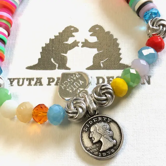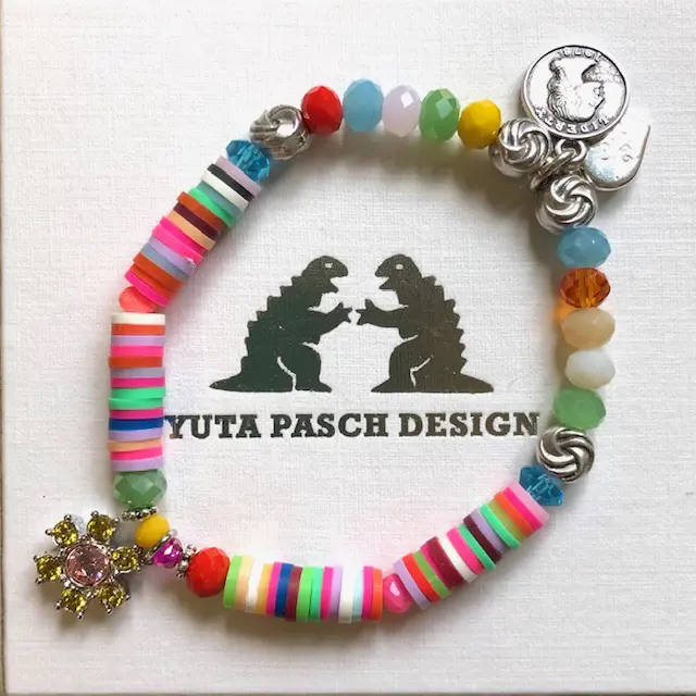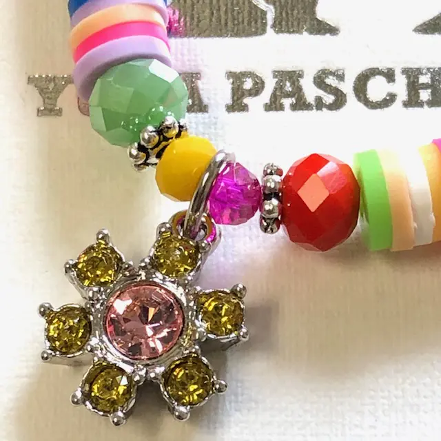 Tolles Sommerarmband und super zu kombinieren! Es baumelt als Blickfang eine Strassblume und gegenüber baumelt neben unserem Logoherz ein kleiner Münzanhänger. Geschliffenes Glas, bunte Polymerscheiben, versilberte Elemente, one size (18cm)