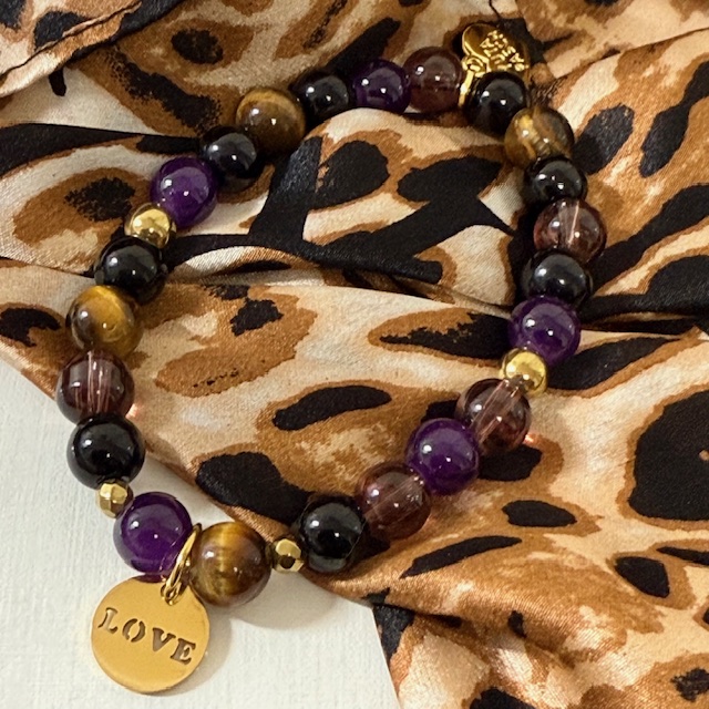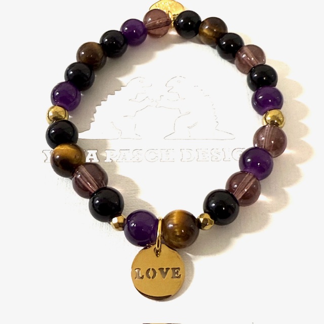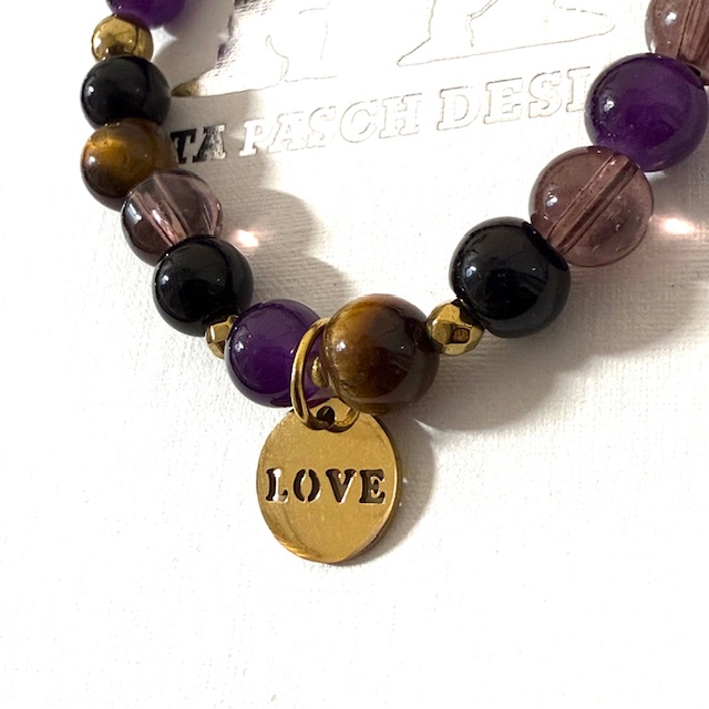 18 K vergoldeter LOVE Anhänger mit verschiedenen Edelsteinen wie Hematite, Tigerauge, Obsidian, Amethyst.