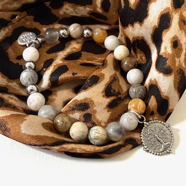 Natürlicher Edelstein in grau-beige Tönen kombiniert mit Hematite / Edelstein und einem Lebensbaum Anhänger.