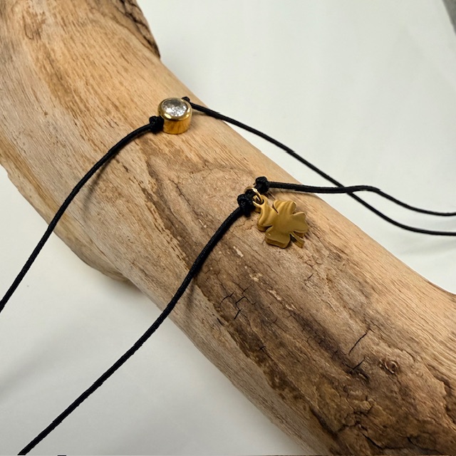 Zwei sehr süße Stretcharmbänder mit kleinen 18 K vergoldeten Anhängern zum Selberknoten und nicht mehr ausziehen!