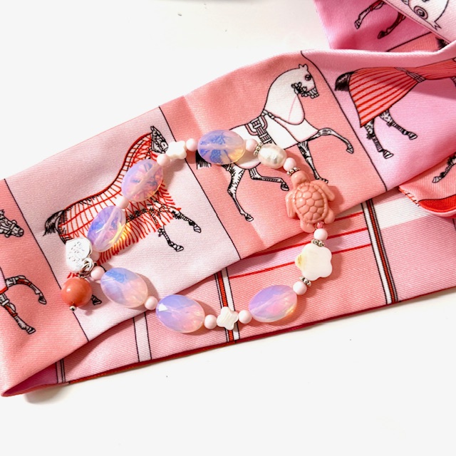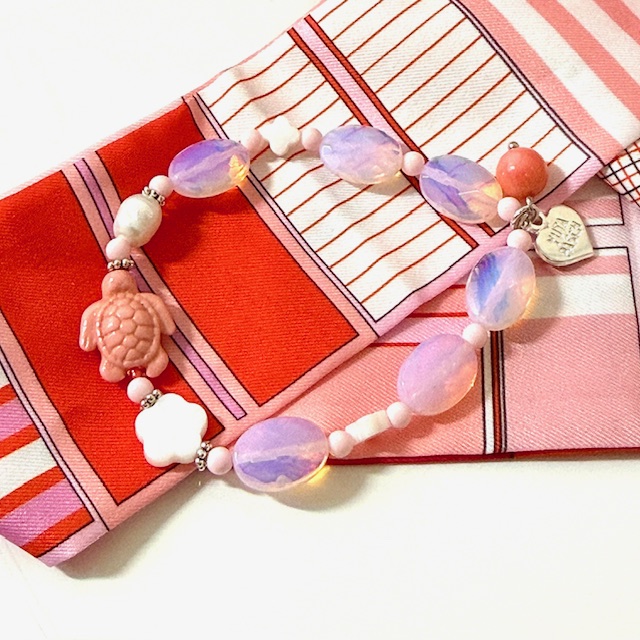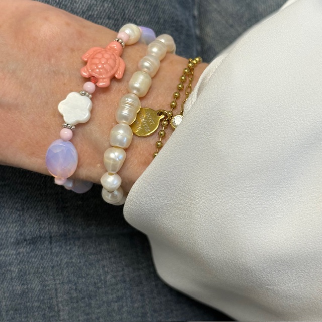 Für alle Pastell-Fans ist dieses Armband in zart rosa-weiß ein schöner Begleiter mit hochwertigen Materialien wie Perlmuttblumen, einer Süsswasserperle, Halbedelsteinen, Bambuskoralle, Opalglas, versilberten Elementen und Logoherz.