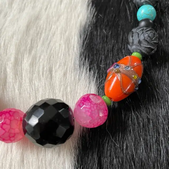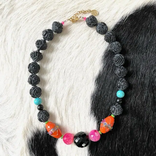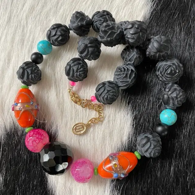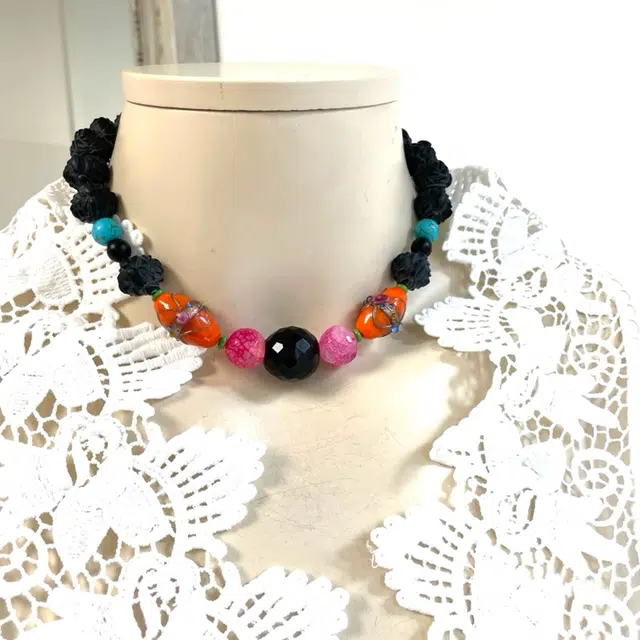 Ein echter Hingucker ist unsere neue coole, kurze Kette bestehend aus wertvollen Materialien: Vergoldeter Sterling Silber Verschluss mit Verlängerungskette und Namenslogo, Halbedelsteine wie Achate und Howlite, Muranogläser und Acrylrosen.