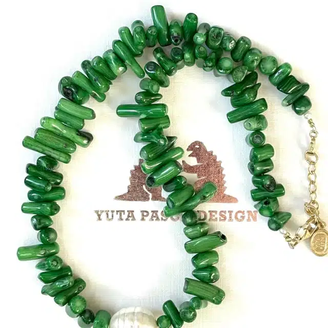 Materialien: 925 Sterling Silber Verschluss vergoldet, gefärbte Bambuskoralle, Muschelkernperle