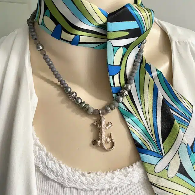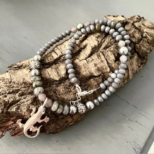 Eine mega schöne, besondere Kette mit einem Sterling Silber Gecko, Halbedelsteinen, Muschelkernperlen, echt silbernen Balibeads, Natursteinen, Glasperlen und einem kleinen Sterling Silber Verschluss.