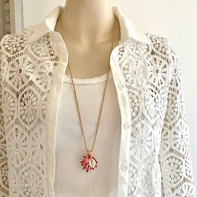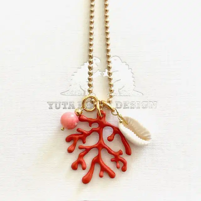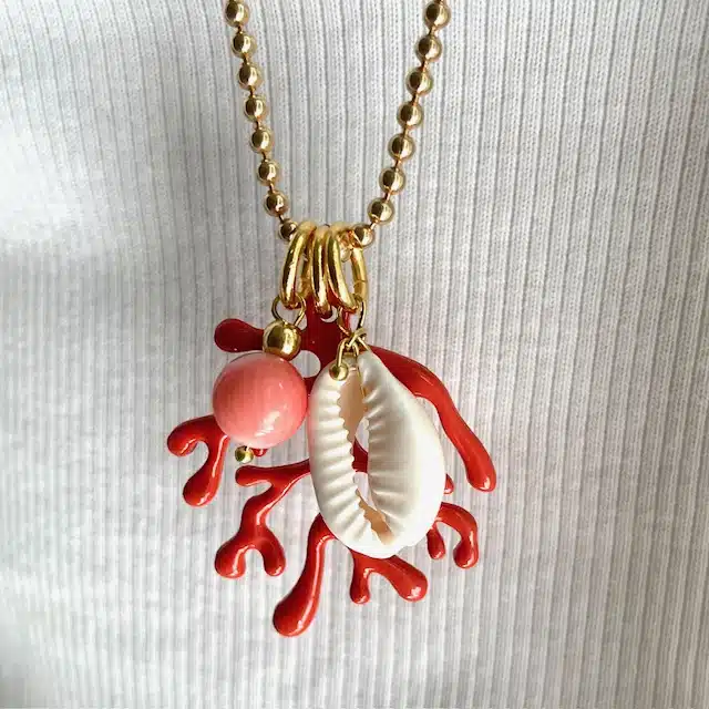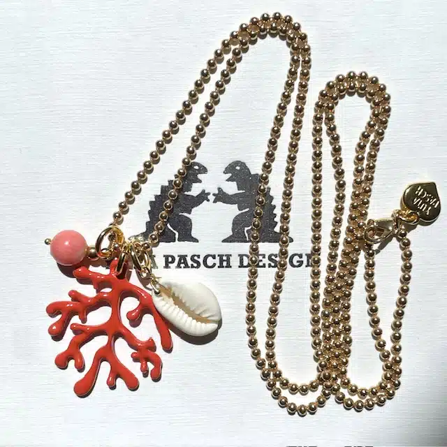 Kauri Muschel und eine Halbedelstein Perle ( Bambuskoralle). Unser Logoherz ist 24 K vergoldet.