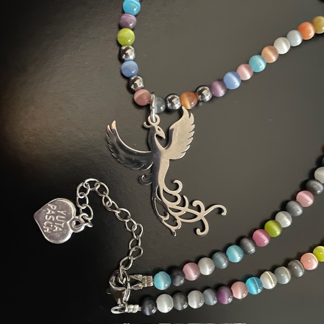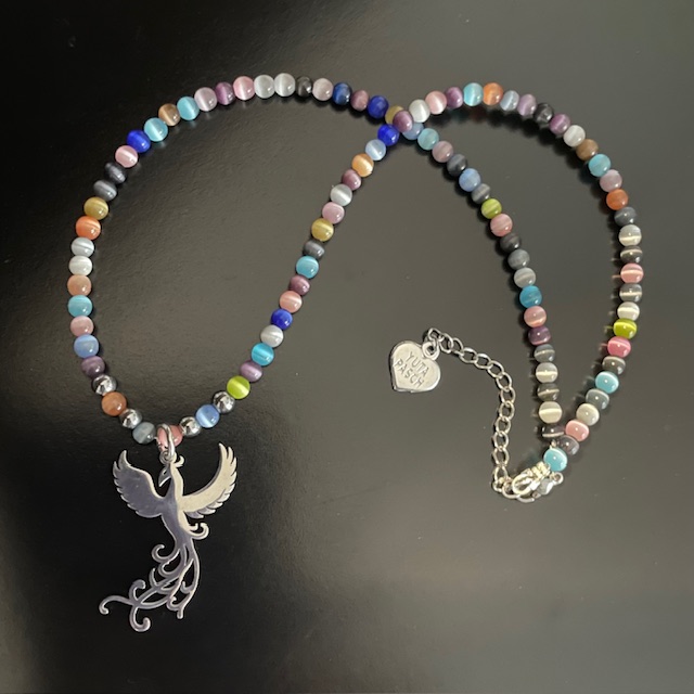 Edelsteinkette im mega schönem Farbmix mit einem Phoenix Anhänger. Der Phoenix symbolisiert den Neuanfang.