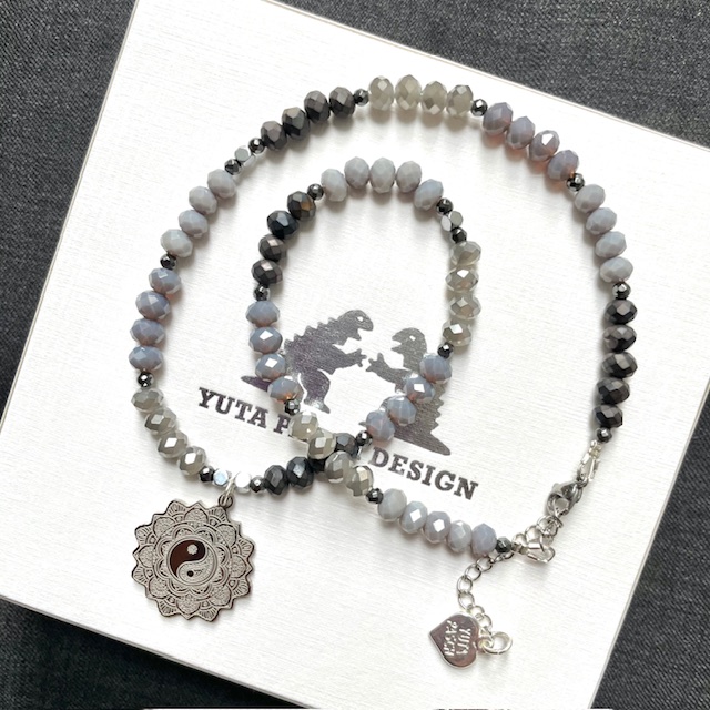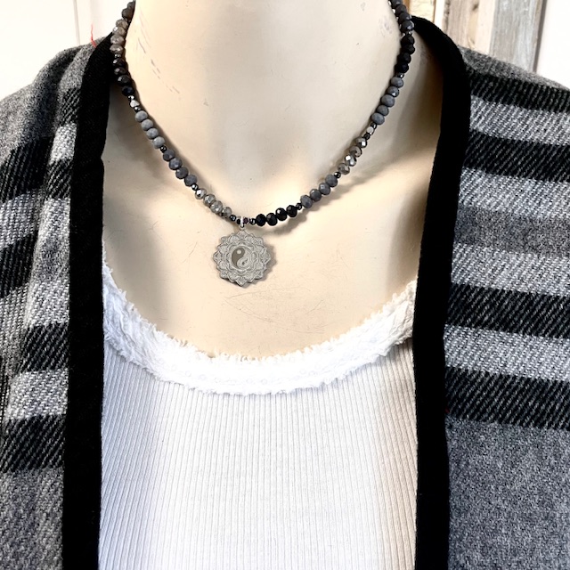 Schlichte, elegante Kette in verschiedenen Grauabstufungen mit einem positiven Anhänger mit der Symbolkraft der BLUME DES LEBENS und YIN & YANG. Die Blume des Lebens ist das Urmuster der Schöpfung und gilt auch als Schutzsymbol.