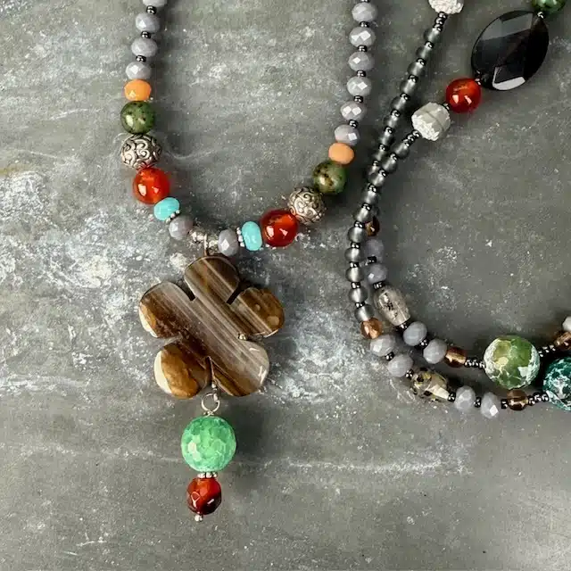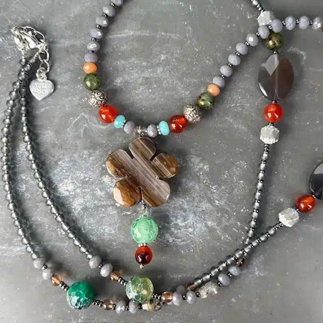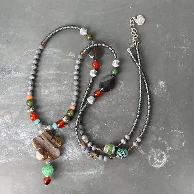 Wunderschöne, hochwertige grau- bunte Kette mit vielen verschiedenen Edelsteinen ( Achate, Karneol, Jade ), Rocaillesperlen, echt Silber Kugeln und Glasschliffperlen. Diese Kette mit einer dicken Achatblume passt Mega zur schlichten Bluse, aber auch zum dicken Pulli und Euren Sommertuniken und Kleidern.