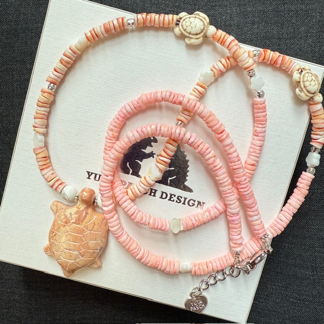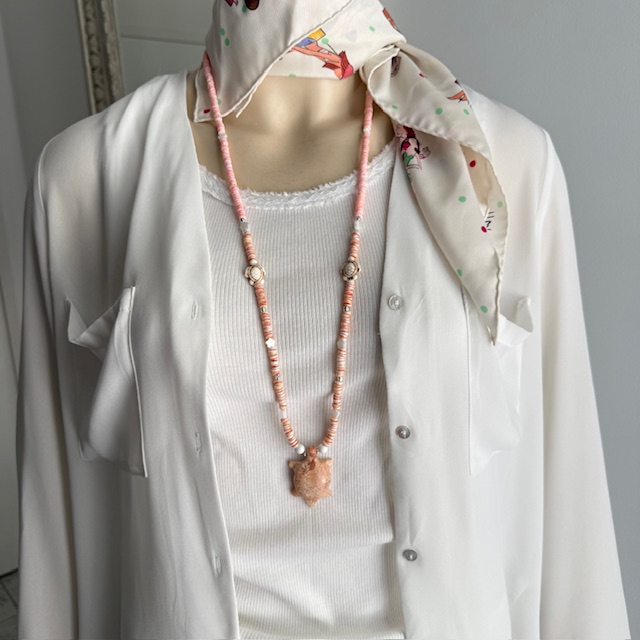 Natur pur. Eine wunderschöne Kette mit einer tollen Aura und wertvollen Materialien: Muschelperlen, Perlmuttblumen, Naturstein Schildkröte 4,5 cm, Halbedelstein Schildkröten, Howlite, 999 versilberte Elemente und Logoherz.
