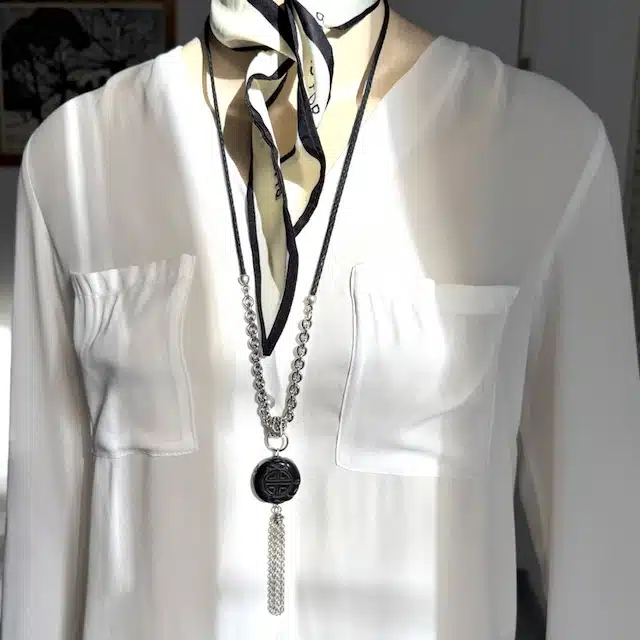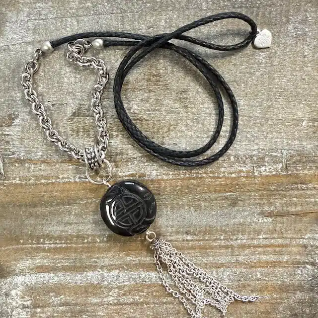 Kette mit einem eingravierten Edelstein, Obsidian. Diese Gravur symbolisiert ein ‚Langes Leben‘.