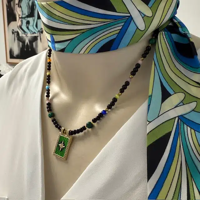 Edelstein Kette mit einem mit Zorkonia besetzten Emaillie Anhänger. Materialien: Verschiedene Edelsteine wie Hematite, Onyx, Katzenauge und Malachite, Rocaillesperlen, 18 K vergoldete Elemente und 24 K vergoldetes Logoherz