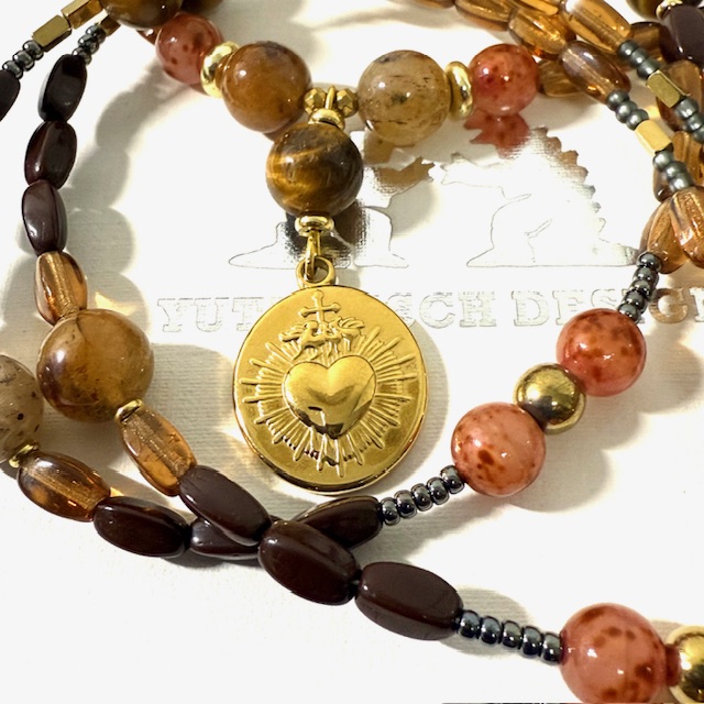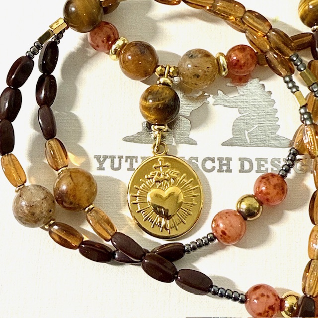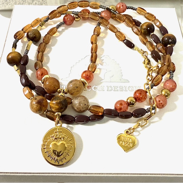 Materialien: In Deutschland handgefertigte Glasstäbchen, Edelstein Tigerauge & Achate, Halbedelsteine Hämatit, Natursteine, Rocaillesperlen, 18 K vergoldeter 2 cm großer Anhänger, 24 K vergoldetes Logoherz.