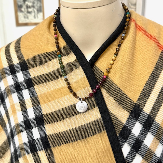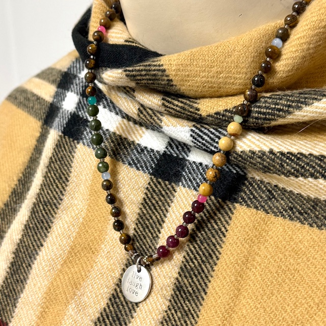 Mittellange, wertvolle Kette ( ca. 51 cm ) mit verschiedenen Edelsteinen wie Tigerauge, Jaspis, Jade, Granat, Glasperlen und einem versilberten Anhänger ( 2 cm ).