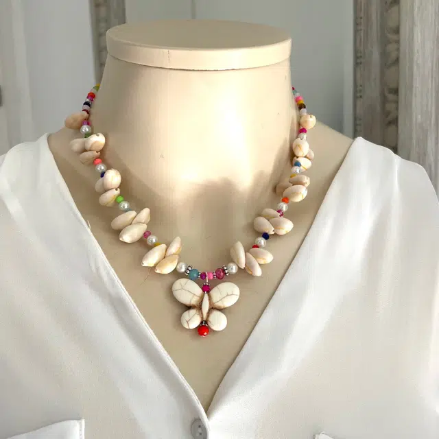 Materialien: Naturmuscheln, Halbedelstein Schmetterling, Glasschliffperlen, Kulturwachsperlen und versilberte Elemente, Verschluss und Namenslogo.