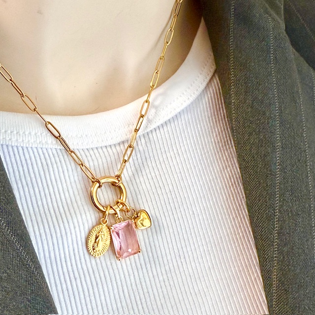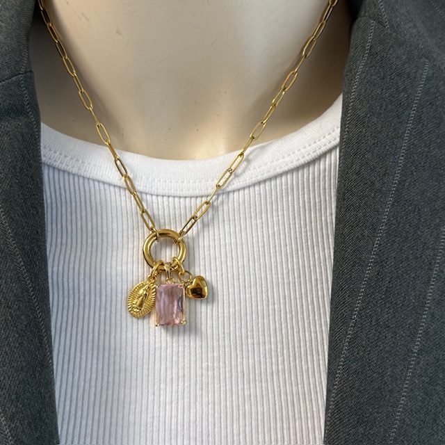 Länge ca. 44 cm, rosa Glasstein 1,5 cm, Mutter Gottes 1,3 cm, Herz ca. 0,9 cm.