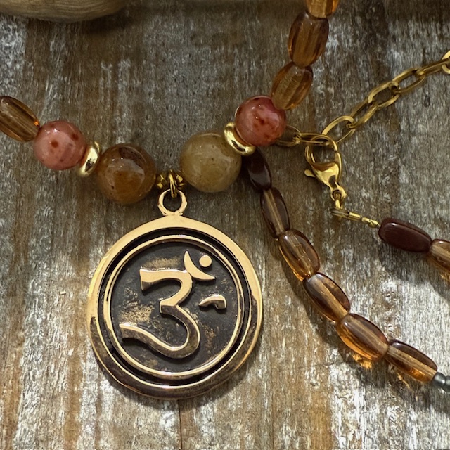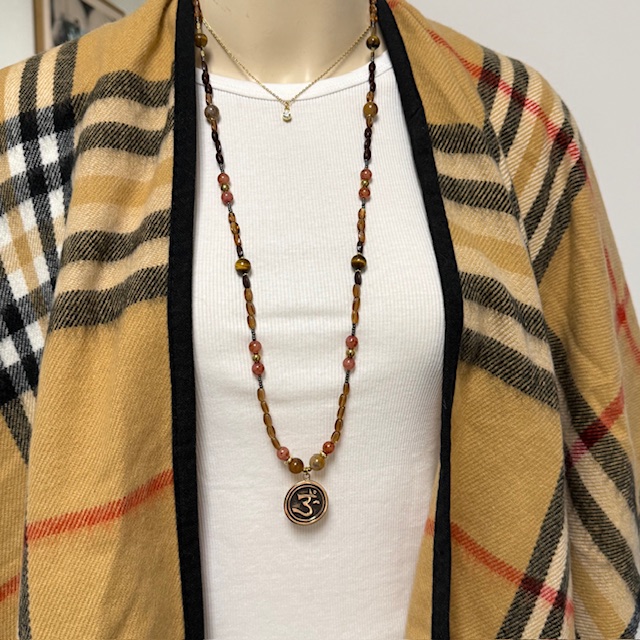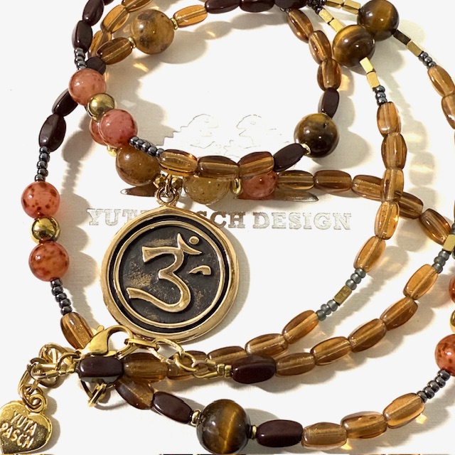 Wunderschöne ca. 86 cm lange Kette mit einem 3 cm großen OM Anhänger, Edelsteinen Tigerauge, Achate, Hematite, Natursteine, Rocaillesperlen und von Hand in Deutschland gefertigten, ovalen Glassteinen.